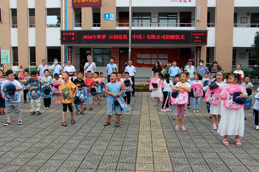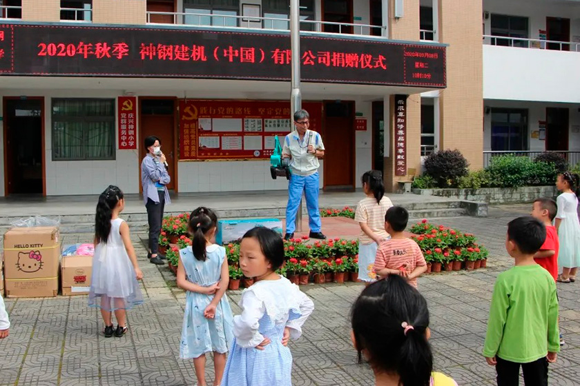 2020年9月8日,KCMC企畫本部本部長巖間征人、生產(chǎn)本部本部長成瀨隆洋等一行10人,來到慶興神鋼小學(xué)。為新入學(xué)的孩子們送上了書包、印有公司LOGO的棒球帽和一個大大的挖掘機模型等開學(xué)禮物。